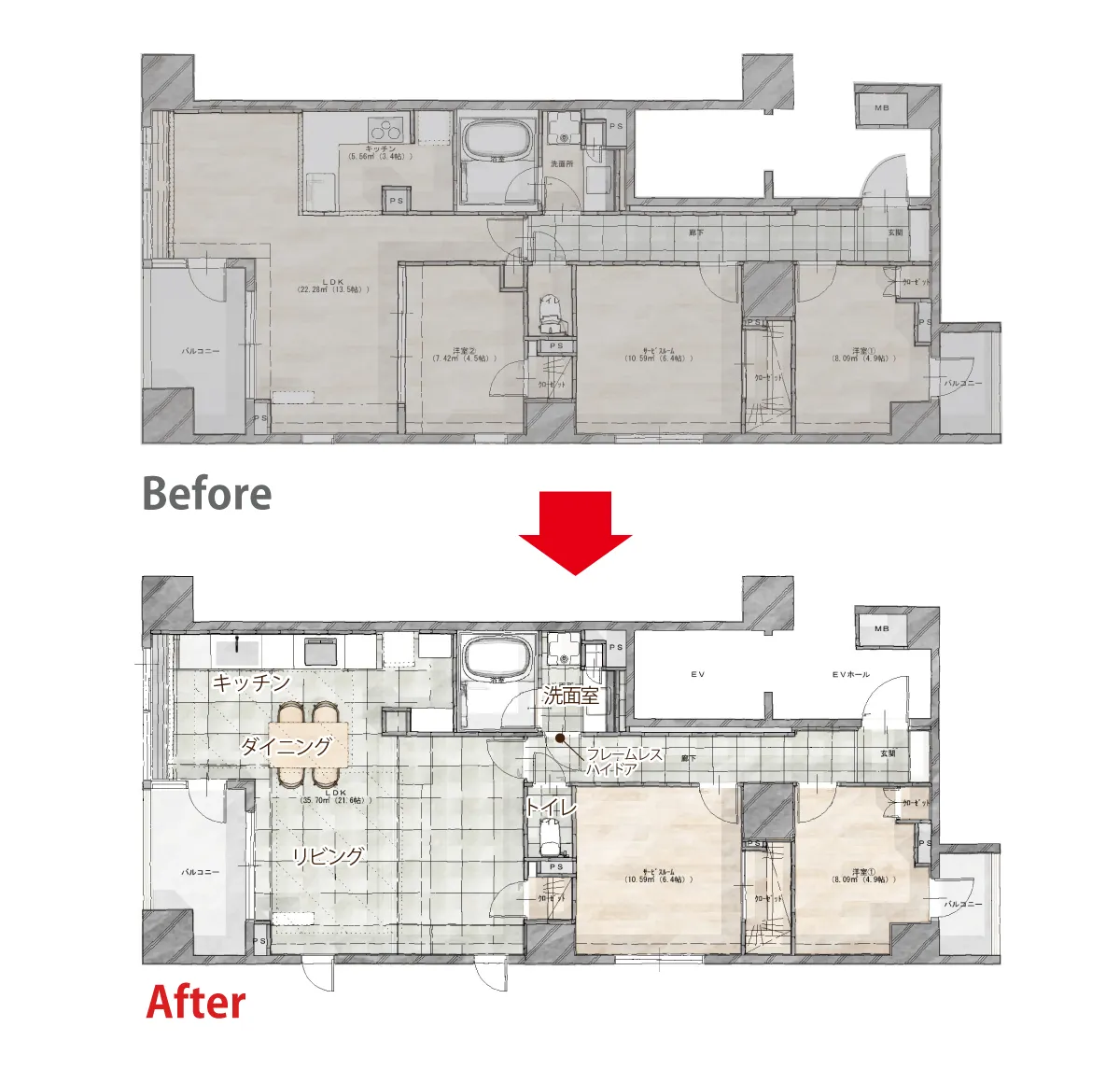 お子様の誕生をきっかけにご自宅で過ごす時間が増え、中古マンションをご購入。しかしこれからの暮らしを考える中で、間取りの使いづらさや内装への物足りなさを感じていらっしゃいました。”より心地よく過ごせる住まいへ”。そんな想いからリフォームのご相談をいただきました。